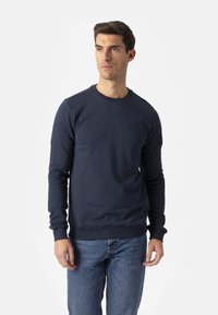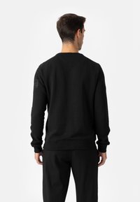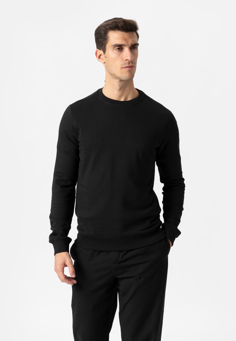Czarny dziany sweter z okrągłym dekoltem, ściągaczami przy mankietach i dole. Gładka, dopasowana tekstura, noszony z czarnymi spodniami.