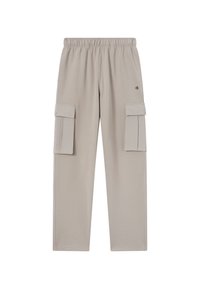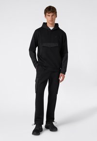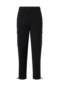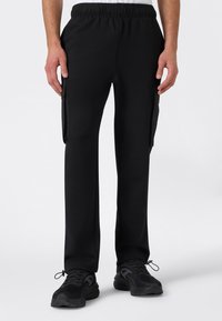 Czarne dresy z elastycznym pasem, prostym krojem i bocznymi kieszeniami typu cargo. Wykonane z miękkiego materiału o gładkiej fakturze.