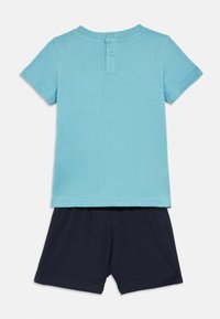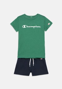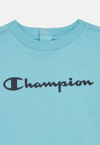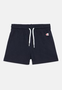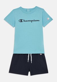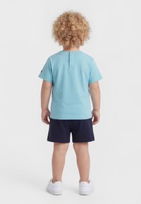 Małe dziecko o kręconych blond włosach, ubrane w jasnoniebieski t-shirt marki Champion, granatowe szorty ze sznurkiem oraz białe trampki, stoi na białym tle.