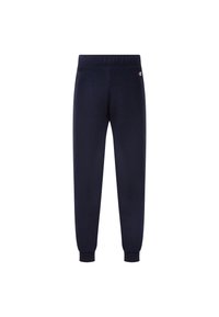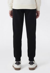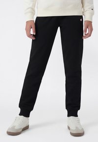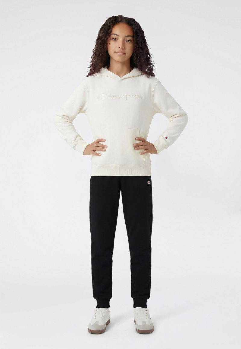 Młoda osoba stojąca z rękami na biodrach, ubrana w kremową bluzę z kapturem, czarne spodnie dresowe i białe trampki na jednolitym białym tle.