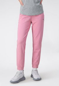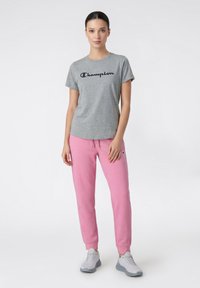 Dolna część ciała w jasnoróżowych spodniach dresowych, szarej koszulce i białych trampkach z szarymi podeszwami, stojąca z rękami na biodrach.