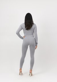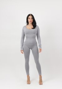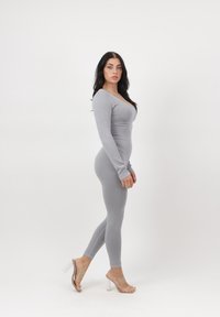 Kobieta o ciemnych włosach, ubrana w dopasowany, prążkowany szary top z długim rękawem i pasujące legginsy, stojąca z jedną ręką na biodrze na białym tle.