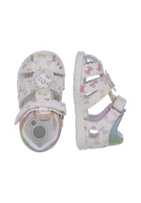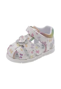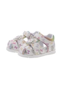 Biała sandałka z kwiatowymi wzorami w kolorach różowym, żółtym i niebieskim, z teksturowanym, wielobarwnym obcasem oraz regulowanymi paskami dla pewnego dopasowania.