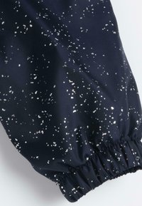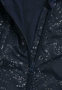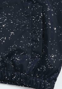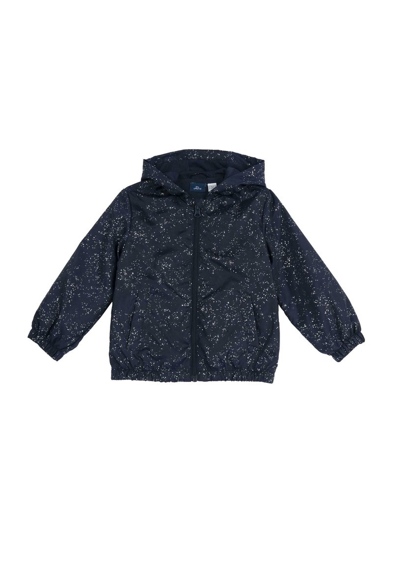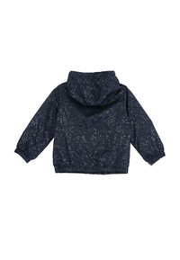 Granatowa dziecięca kurtka z kapturem, z zamkiem błyskawicznym z przodu, elastycznymi mankietami, dołem, dwiema przednimi kieszeniami oraz białym, plamkowanym wzorem.