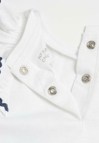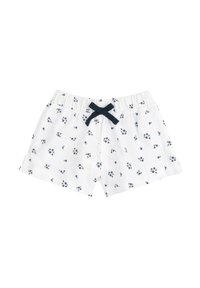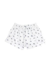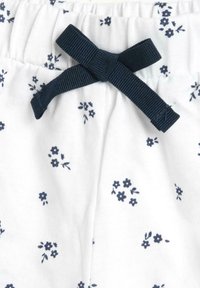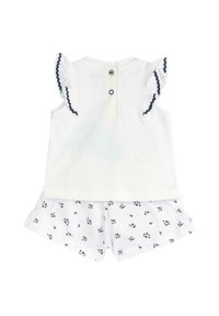 Biały krótki zestaw z bawełny z grafiką niebieskiego wieloryba. Rękawy z falbankami wykończone granatową lamówką. Szorty w kwiatowy wzór w kolorze granatowym na białym tle.