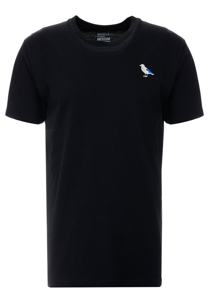 Czarna bawełniana koszulka z krótkim rękawem, z małym haftowanym niebiesko-białym ptakiem na piersi. Klasyczny krój z okrągłym dekoltem.