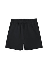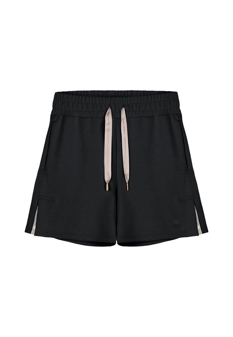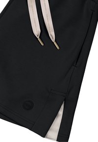 Czarne casualowe szorty z elastycznym pasem, beżowymi troczkami z złotymi końcówkami, bocznymi kieszeniami i małymi bocznymi rozcięciami z beżowymi detalami.