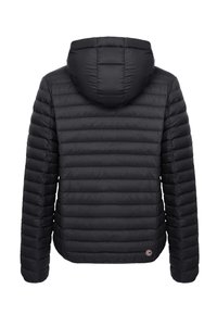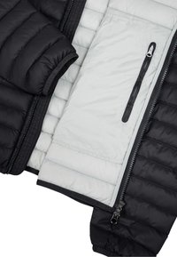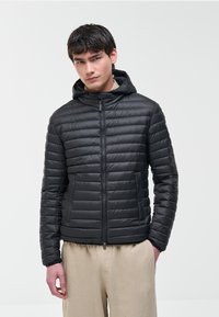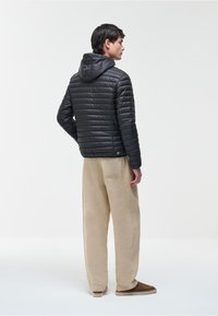 Młody mężczyzna w czarnej pikowanej kurtce z kapturem i beżowych spodniach, stojący z jedną ręką w kieszeni na jednolitym tle.