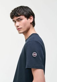 Młody mężczyzna o ciemnych włosach, ubrany w gładki, ciemnogranatowy T-shirt i białe spodnie, patrzący w lewo, z jedną ręką w kieszeni.