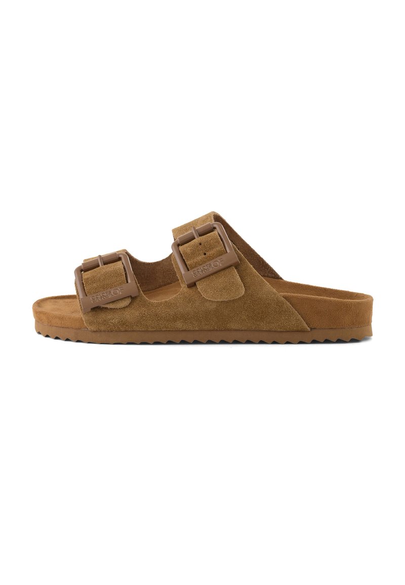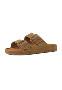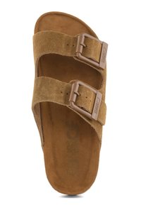 Brązowa zamszowa klapka na płaskiej podeszwie z dwoma regulowanymi paskami i plastikowymi klamrami, podeszwa z rowkowanym spodem dla lepszej przyczepności.