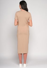 Kobieta w ciąży w beżowej sukience midi i białych trampkach, stojąca bokiem z jedną ręką na brzuchu, uśmiechająca się na tle jednolitego tła.