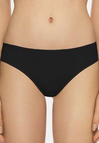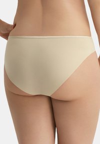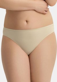 Kobieta ubrana w beżową, bezszwową bieliznę typu bikini, z jedną ręką spoczywającą na talii.