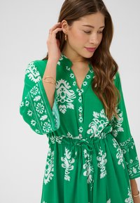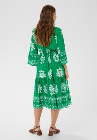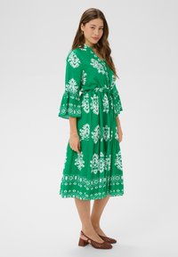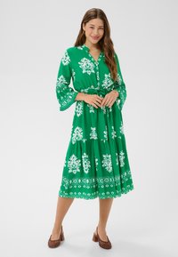 Kobieta stojąca w zielonej sukience midi z białym kwiatowym wzorem, długimi rękawami i brązowymi plecionymi butami na klockowym obcasie, uśmiechająca się z złożonymi dłońmi.