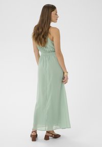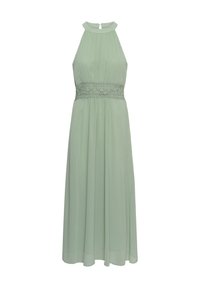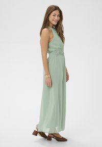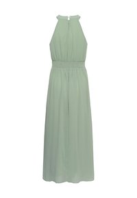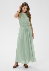 Kobieta w bezrękawowej, jasnooliwkowej maxi sukience z kwiatowym paskiem, nosząca brązowe buty na obcasie i złotą biżuterię, pozująca z jedną ręką dotykającą włosów.