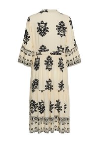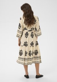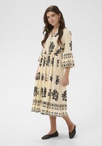 Kobieta o długich brązowych włosach, ubrana w kremową midi sukienkę z czarnymi kwiatowymi wzorami oraz czarne plecione baleriny, stoi z jedną ręką na biodrze.