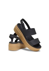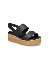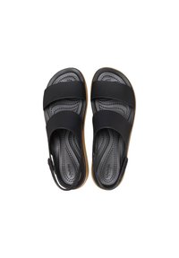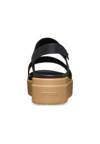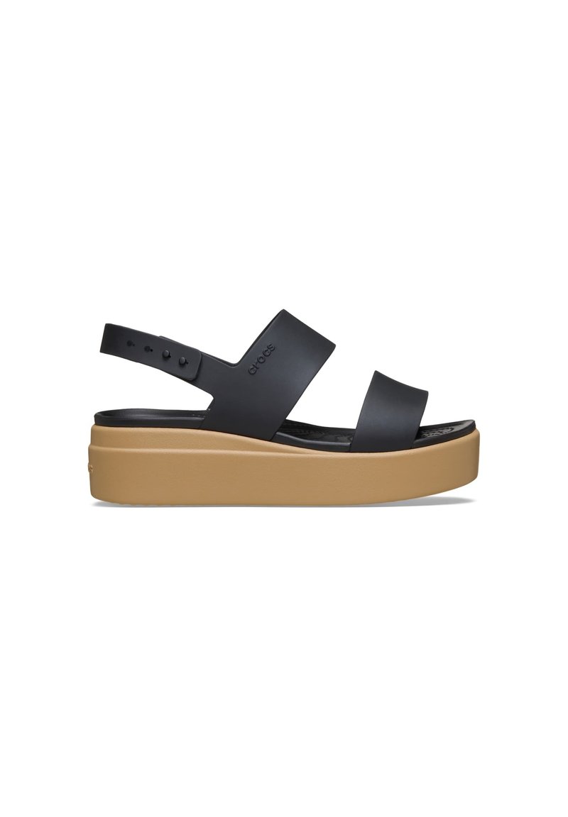 Czarne sandały na platformie z dwoma szerokimi paskami, wykonane z gładkiego materiału syntetycznego, z beżową podeszwą i regulowanym paskiem na kostkę.