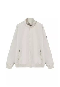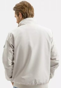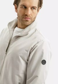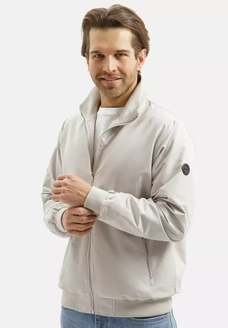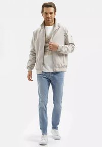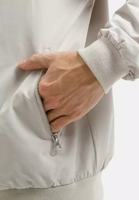 Mężczyzna z jasnobrązowymi włosami w jasnobeżowej kurtce na zamek, poprawiający rękaw, uśmiechający się na jednolitym białym tle.