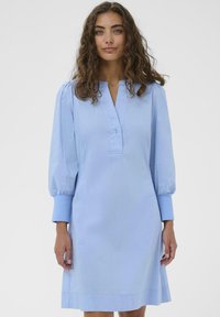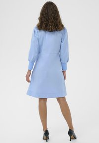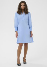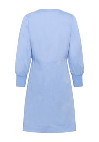 Kobieta o kręconych włosach, ubrana w jasnoniebieską sukienkę z długim rękawem, dekoltem w kształcie litery V i zapinanymi na guziki mankietami, stoi na tle jednolitego tła.