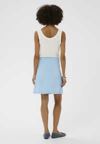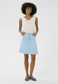 Kobieta ubrana w jasnoniebieską, zapinaną na guziki spódnicę dżinsową z przednimi kieszeniami, jedną rękę w kieszeni, oraz białą bluzkę, stojąca na jednolitym tle.