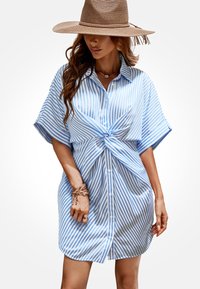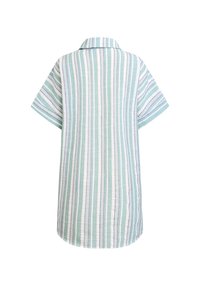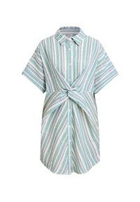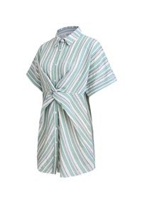 Koszula na guziki w paski w jasnym odcieniu turkusu i kremu, z krótkimi rękawami, kołnierzykiem oraz wiązaniem w talii podkreślającym dopasowaną sylwetkę.