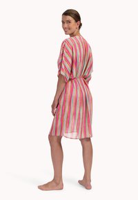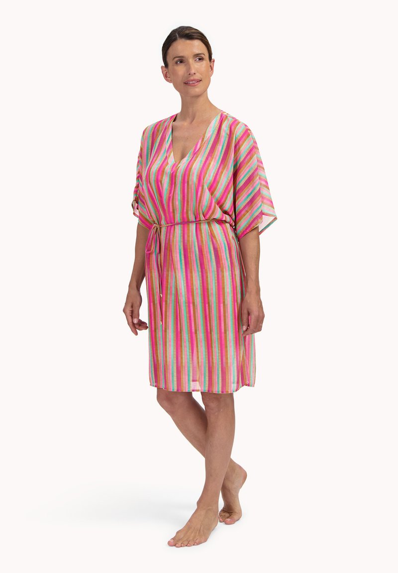 Kobieta w kolorowej, paskowej sukience o długości do kolan z dekoltem w serek i luźnymi rękawami, stojąca boso w swobodnej pozie, z zawiązanym paskiem w talii.