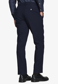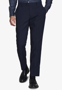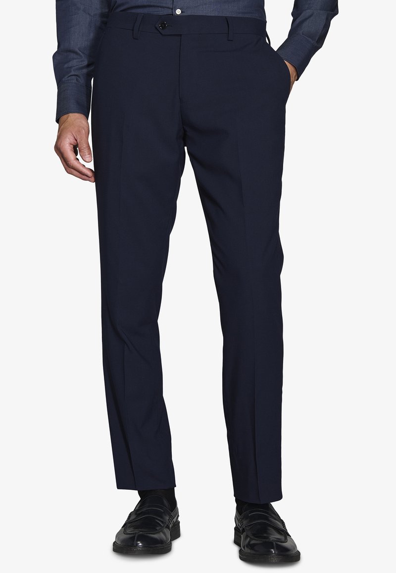 Mężczyzna ubrany w granatowe spodnie wizytowe, ciemnoniebieską koszulę na guziki i czarne wizytowe buty, stoi z jedną ręką w kieszeni.