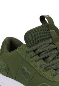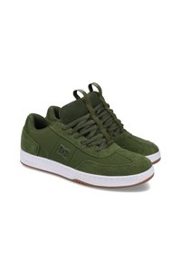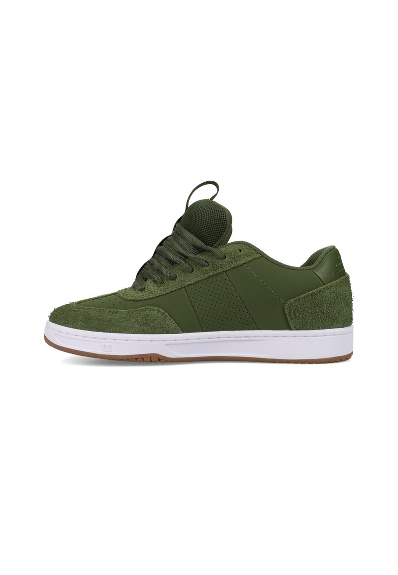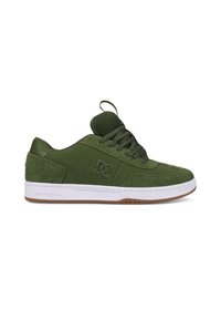Zielone trampki wykonane z połączenia zamszu o fakturze i gładkich syntetycznych materiałów, z białą gumową podeszwą i perforowanymi detalami po bokach.
