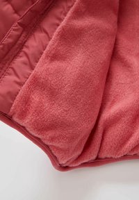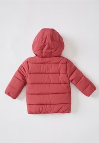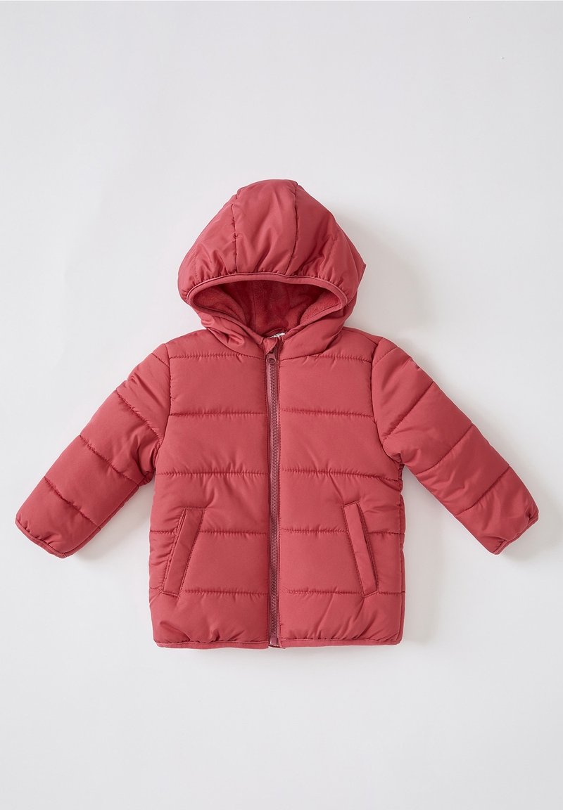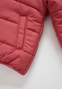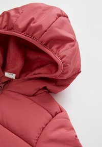 Dziecięca pikowana kurtka z kapturem w kolorze zgaszonego różu, z zamkiem z przodu i dwoma bocznymi kieszeniami, pokazana na płasko na białym tle.