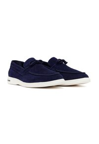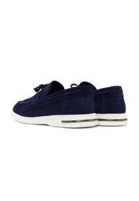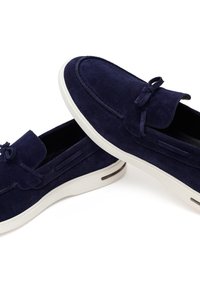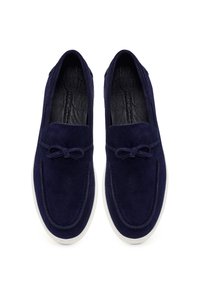 Granatowy zamszowy mokasyn z białą gumową podeszwą, dekoracyjną kokardą na górze oraz metalowym akcentem na pięcie.