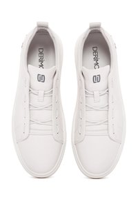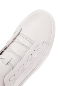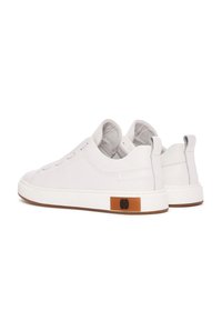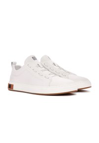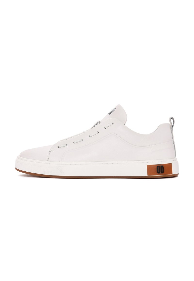 Niskie białe sneakersy z gładką skórzaną cholewką, otworami na sznurówki bez sznurówek, brązowym detalem na podeszwie oraz pętelką z tyłu przy pięcie.