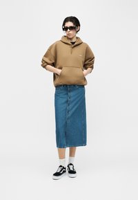 Osoba nosząca niebieską spódnicę midi z denimu z guziczkami z przodu, białe skarpety za kostkę, czarno-białe niskie trampki oraz brązową bluzę.