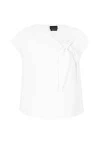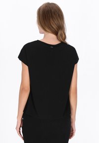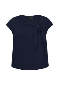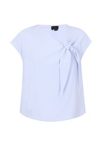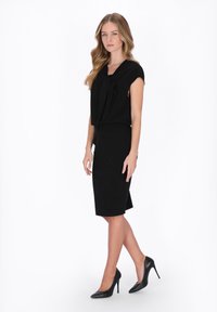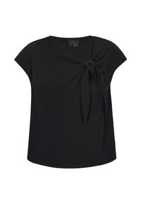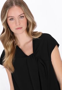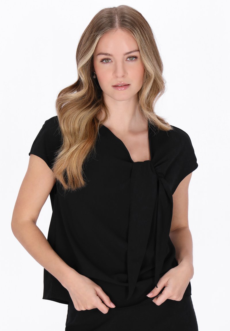 Kobieta z długimi falowanymi blond włosami, ubrana w czarną bluzkę z krótkim rękawem z wiązaniem z przodu, stojąca na białym tle.