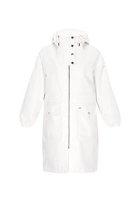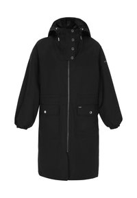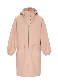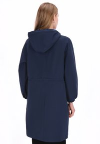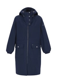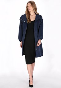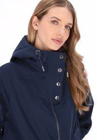 Granatowy, wodoodporny płaszcz przeciwdeszczowy z kapturem, zapinany na zamek z przodu, z elastycznymi mankietami, wiązaniem w talii i dwoma przednimi kieszeniami. Gładki, wodoodporny materiał.