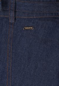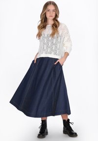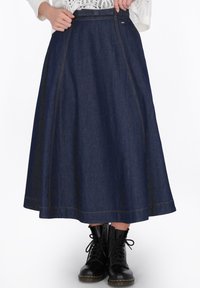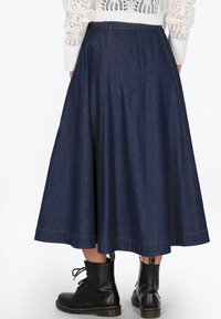 Kobieta w ciemnoniebieskiej jeansowej spódnicy w kształcie litery A z wysokim stanem i czarnych sznurowanych botkach do kostki, ręce poprawiające pasek spódnicy.