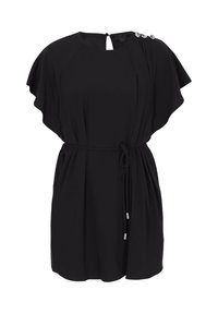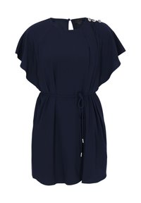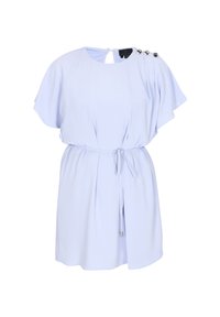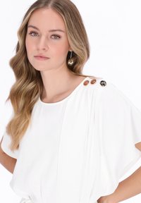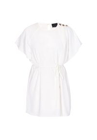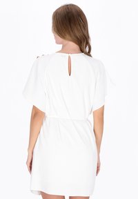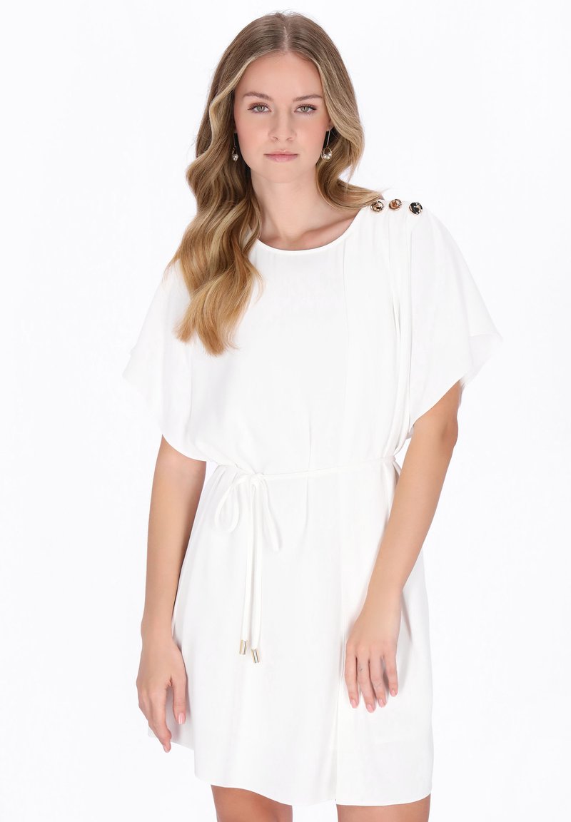 Młoda kobieta o falujących blond włosach nosi białą sukienkę z krótkim rękawem, z guzikami na ramionach i paskiem związanym w talii.