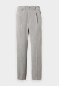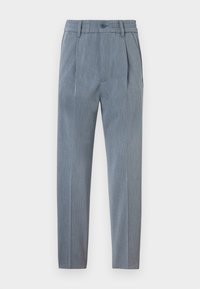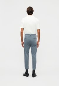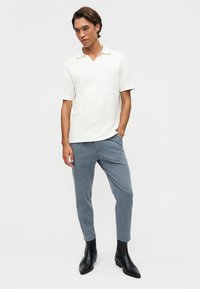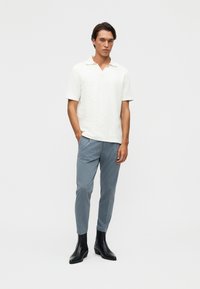 Mężczyzna ubrany w jasnoniebieskie dopasowane spodnie z przodu z zakładkami i czarne skórzane botki, stojący na białym tle.