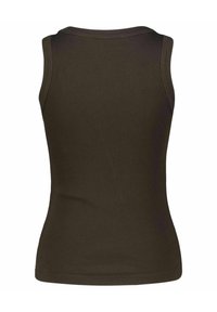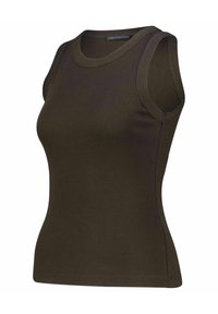 Brązowy prążkowany top na ramiączkach z okrągłym dekoltem i bez rękawów, zestawiony z dopasowanymi ciemnymi skórzanymi spodniami. Gładka tekstura.