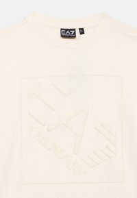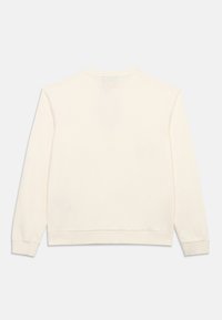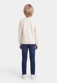 Blond chłopiec stoi z jedną ręką w kieszeni, ubrany w kremową bluzę z wypukłym logo, niebieskie dżinsy i białe trampki na białym tle.