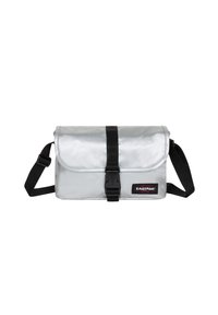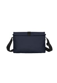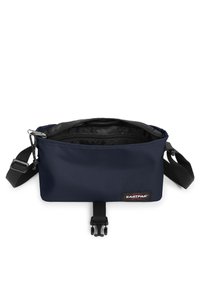 Granatowa torba kurierska wykonana z trwałego materiału, wyposażona w klapę z czarnym paskiem i sprzączką oraz regulowany pasek na ramię.