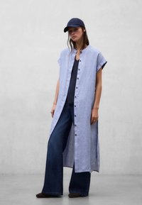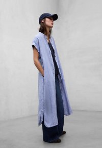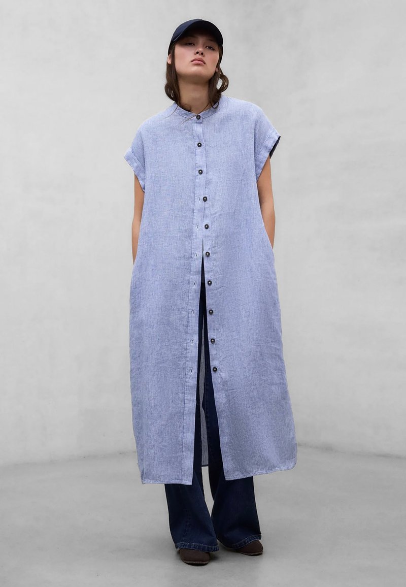 Kobieta ubrana w długą, jasnoniebieską, bezrękawnikową sukienkę zapinaną na guziki, na ciemnych spodniach, w czapce z daszkiem i brązowych butach, stojąca na tle szarej ściany.