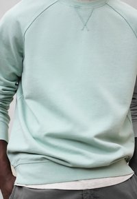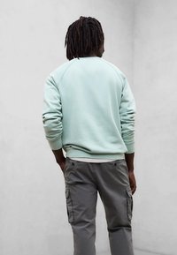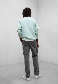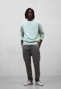 Mężczyzna z dredami ubrany w jasnozieloną bluzę i szare spodnie, stojący z rękami w kieszeniach na jednolitym szarym tle.
