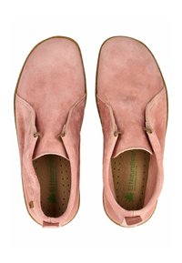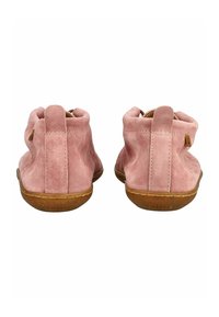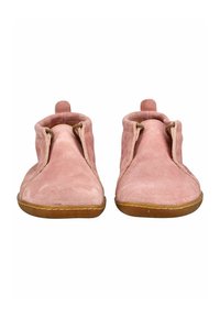 Miękki różowy zamszowy but na kostkę z płaską brązową gumową podeszwą i małą pętelką na pięcie ułatwiającą zakładanie.