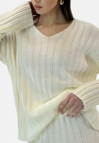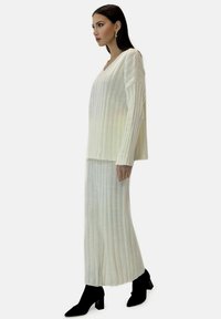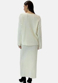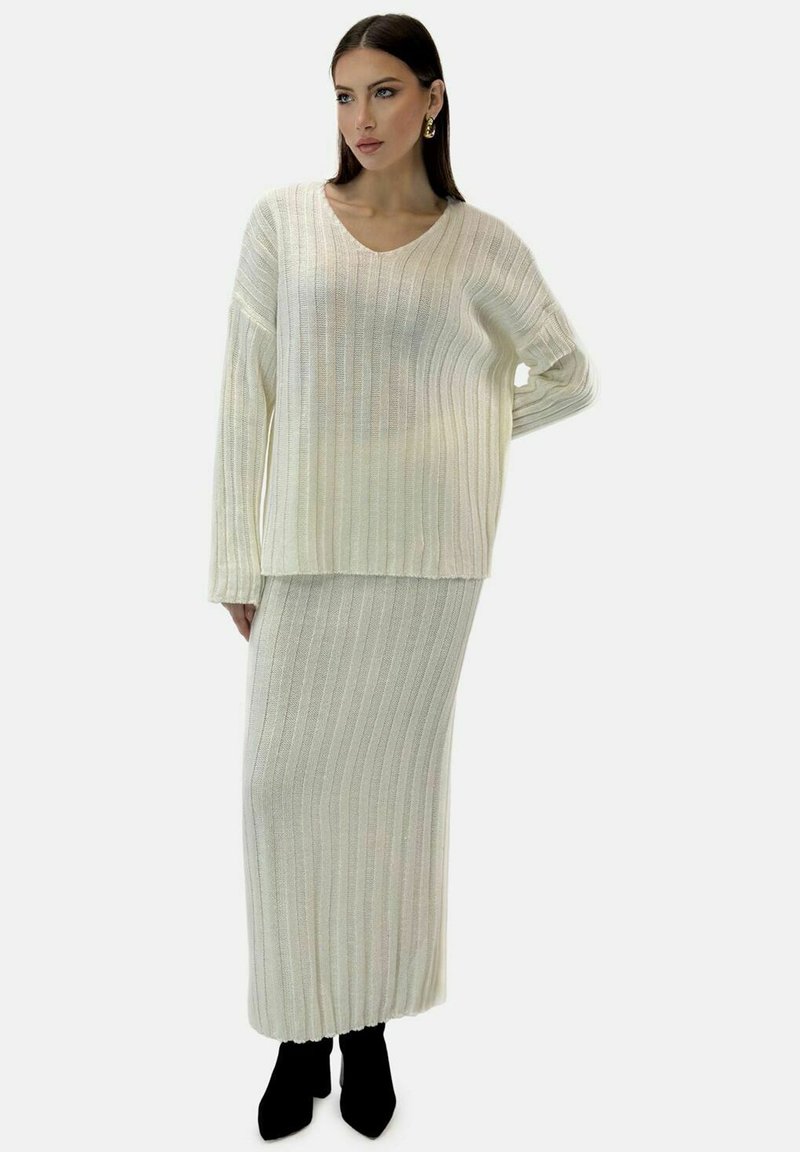 Kremowy prążkowany sweter z dzianiny i dopasowana długa spódnica, z dekoltem w serek, luźnym krojem i fakturowanym wzorem, zestawione z czarnymi botkami za kostkę.