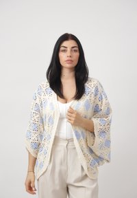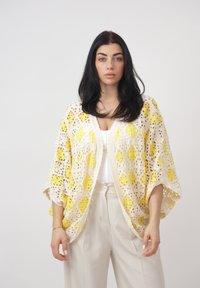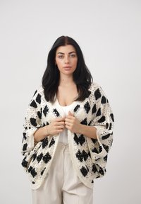 Kobieta o długich ciemnych włosach, ubrana w biały sweter z szydełkowym wzorem diamentów w kolorze czarnym, na tle białej bluzki i beżowych spodni.