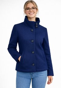 Uśmiechnięta kobieta w okularach, ubrana w granatowy płaszcz zapinany na guziki z wysokim kołnierzem, ręce w kieszeniach, w połączeniu z jasnoniebieskimi dżinsami.