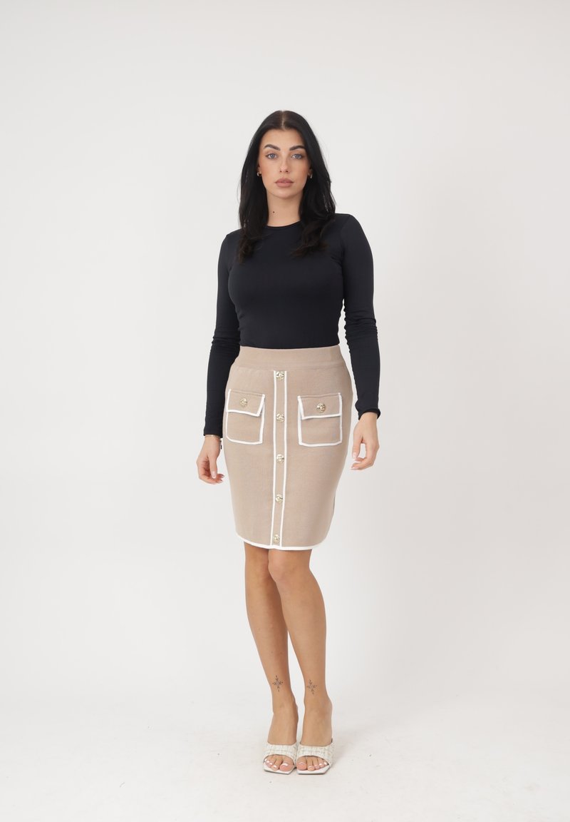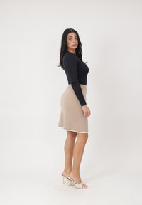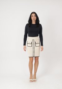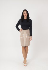 Kobieta stoi, ubrana w czarny top z długim rękawem, beżową spódnicę z białą lamówką i guzikami oraz białe sandały na obcasie na tle jednolitego koloru.