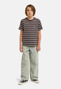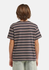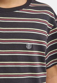 Koszulka w paski w kolorze ciemnogranatowym, z poziomymi paskami w kolorze jasnozielonym, różowym i białym. Krótkie rękawy, okrągły dekolt i mały detal z logo.