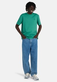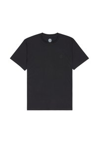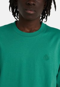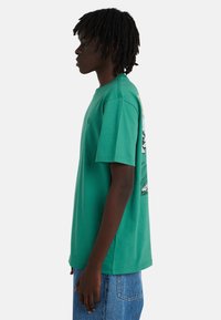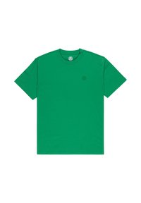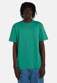 Osoba o ciemnych włosach nosi zieloną koszulkę z motywem gór, namiotu, żaby i roślin oraz napisem "ELEMENT" dużymi pomarańczowymi literami.