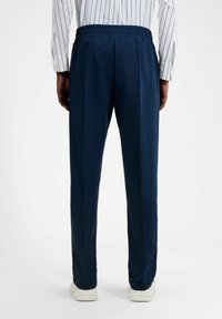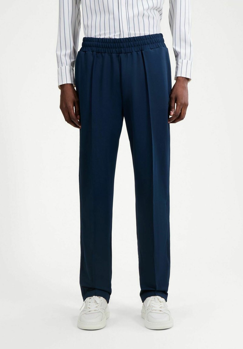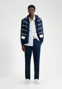 Mężczyzna w granatowych spodniach z elastycznym pasem, białych trampkach i białej koszuli z cienkimi pionowymi paskami, stojący na białym tle.