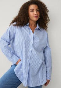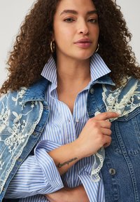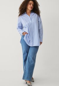 Kobieta o kręconych włosach ubrana w niebiesko-białą, oversize'ową, paskowaną koszulę, niebieskie dżinsy i szpilki w wężowy wzór, pozująca z jedną ręką w kieszeni.